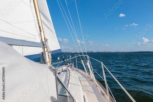 Luxury cruise on a sailing rigged yacht under a genoa sailing towards a shore. City, town on coastline, Tallinn, Estonia, Gulf of Finland, summer sailing