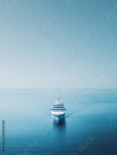 Luxury cruise ship gliding effortlessly through calm blue waters under a clear sky with ample space for text. Generative AI