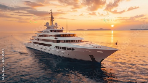 Luxury cruise ship sailing in the ocean, sunset backdrop, and elegant design