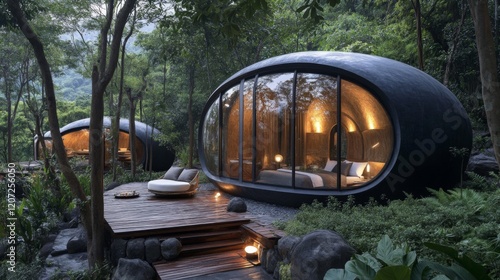 Luxury Eco-Friendly Oval Cabins nestled in Lush Tropical Forest