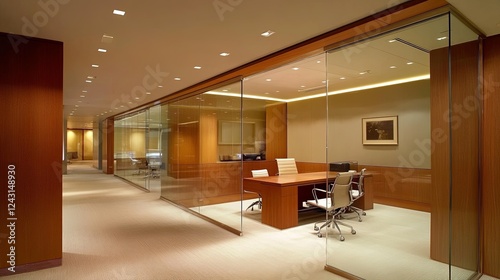 Luxury executive office with minimalist design, glass walls, and wooden finishes.