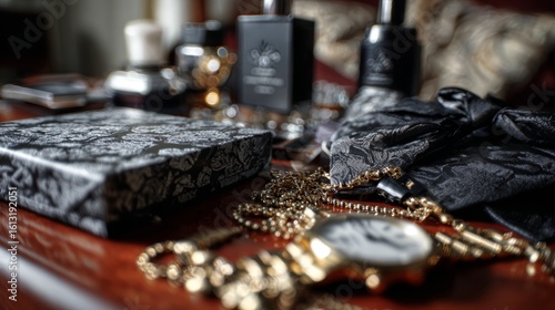 Luxury gift packaging with accessories and jewelry on wooden tray for fashion holiday celebration concept scene