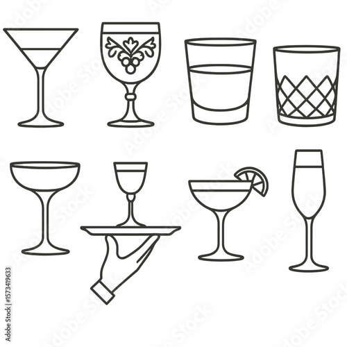 Luxury Glassware Icons. Outline style icons of Lounge and Luxury Glassware: crystal martini glass, etched wine glass, gold-rim