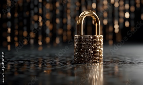 Luxury Gold Padlock with Sparkling Diamond Texture on Dark Reflective Surface