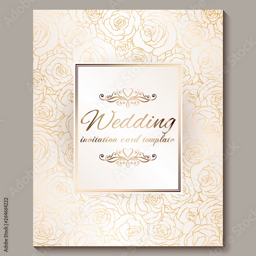 Luxury gold vintage wedding invitation, floral background with place for text, lacy foliage made of roses with golden shiny gradient. Victorian wallpaper ornaments, baroque style template for design
