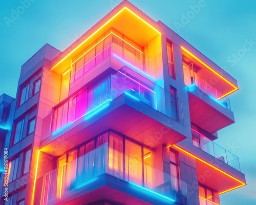 Luxury high-rise apartment building with holographic property and design details floating in mid-air, glowing neon accents, sleek modern architecture, sharp focus