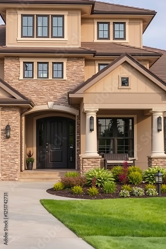 Luxury Home Exterior: Modern Architectural Design, Stone Facade, Landscaped Garden