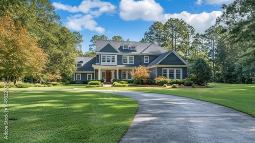 Luxury home, tree-lined driveway, autumn, sunny day, real estate listing