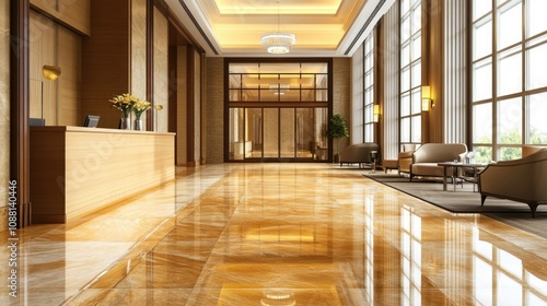 Luxury Hotel Lobby with Marble Flooring, Reception Desk, and Stylish Wooden Design Elements