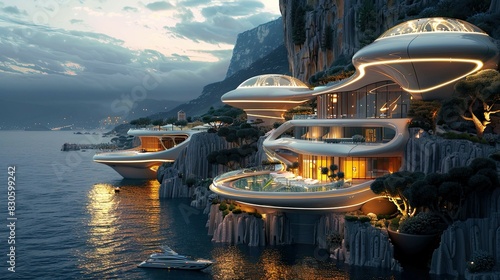 Luxury hotel on the coast of the Mediterranean Sea at night in a futuristic style