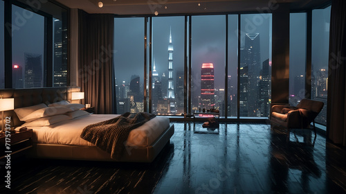 luxury hotel room with city view watching rainfall.