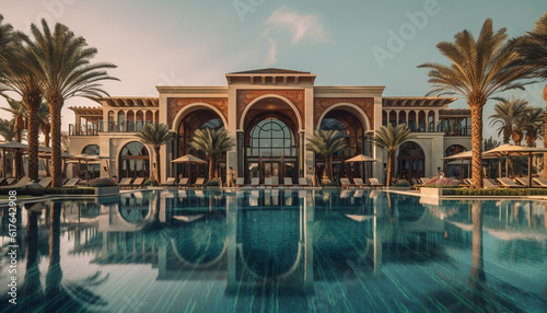 Luxury hotel with poolside palm trees, reflecting modern Arabic style generated by AI