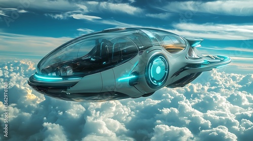 Luxury hover limousine with panoramic windows floating above a bright and vibrant futuristic world
