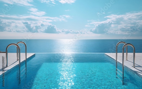 Luxury Infinity Pool Stunning Ocean View with Sparkling Water and Blue Sky Relaxing Resort Vacation Escape : Generative AI