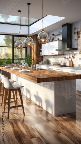 Luxury kitchen interior with new stylish furniture, white marble countertops,