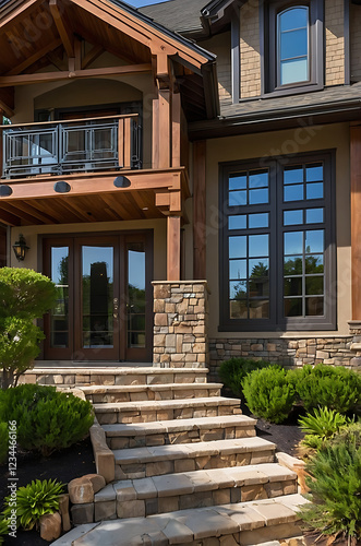 Luxury Mountain Home Exterior: Stone, Wood, & Modern Design. A stunning showcase of residential architecture, featuring a captivating facade, grand entrance, and exquisite landscaping.