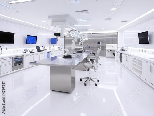 Luxury neuroscience lab with custom stainless steel tables, ergonomic adjustable seating, and smart touchscreen controls
