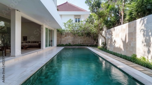 Luxury Poolside Villa: A stunning view of a modern villa with a serene swimming pool, offering a tranquil escape surrounded by lush greenery and contemporary architecture.