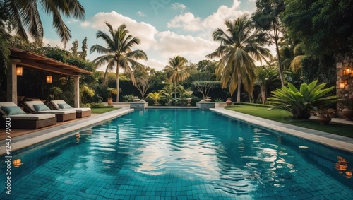 Luxury private swimming pool in a tropical garden setting with palm trees and serene atmosphere ideal for relaxation and leisure activities.