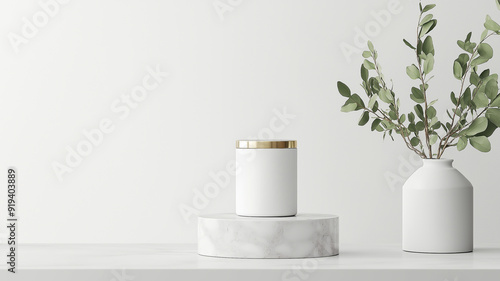 Luxury product on marble pedestal, copy space for tagline, high-end e-commerce