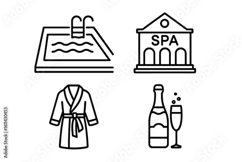 Luxury resort amenities icons set, elegant outline vector of infinity pool, wellness spa building, plush bathrobe, champagne bottle and flute, leisure symbols on transparent background