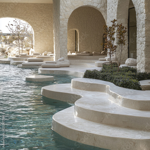 Luxury resort pool with tiered seating, arches, plants, and natural rock features