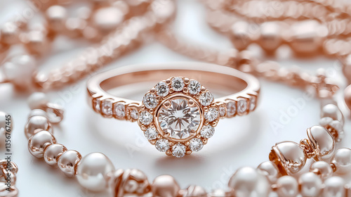Luxury Ring with Diamonds and Pearls: An elegant, rose-gold ring adorned with sparkling diamonds and surrounded by delicate pearl necklaces, a symbol of timeless beauty and sophistication.