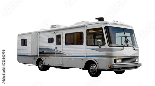 Luxury RV on Road: A spacious RV, designed for comfortable travel, is captured in a realistic shot, exuding an air of adventure, with its sleek design and inviting interior.