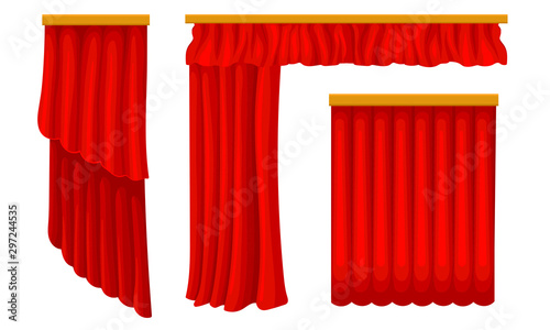 Luxury Scarlet Silk Curtains and Draperies Interior Decoration Design Ideas Realistic Vector Illustrations