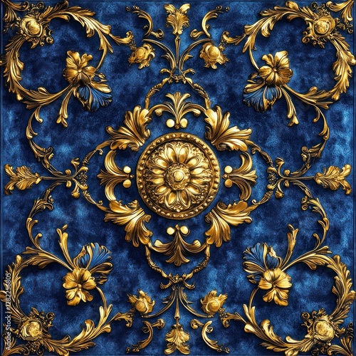 Luxury Silk Scarf with Gold Chains and Lion Head Illustration on Opulent Blue Velvet Background