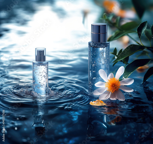 Luxury Skincare Essence on Water with Wildflowers and Dew Drops