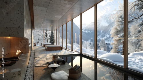 luxury spa retreat with walls made entirely of energy-efficient windows, offering panoramic views of snowy mountains while keeping the warmth inside