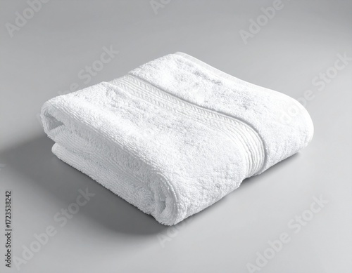 "Luxury spa-style towel, pure white, laid diagonally on a plain matte grey background. Close-up clarity of edges and fibers with soft natural shadows. 1:1 ratio, HD."