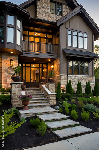 Luxury Stone House Exterior at Night. Modern Home Design, Real Estate, Architecture, Residential Property