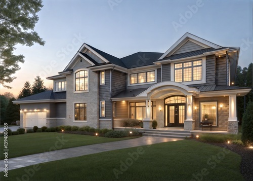 Luxury Suburban Home Stone, Gray Siding, Evening Twilight