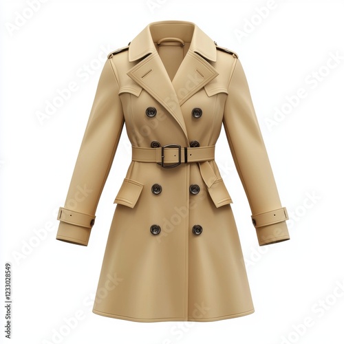Luxury trench coat in beige with a belt and large buttons, centered on a clean white background