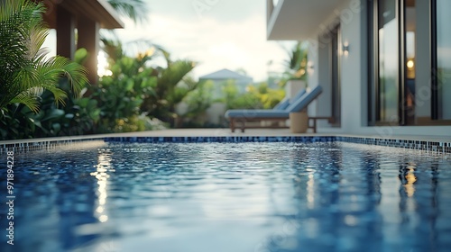 Luxury villa show home in tropical summer holiday resort with swimming pool and sun chairs in garden : Generative AI