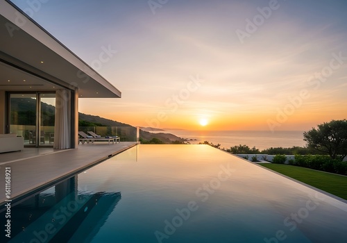 Luxury villa with infinity pool overlooking the sea at sunset for vacations