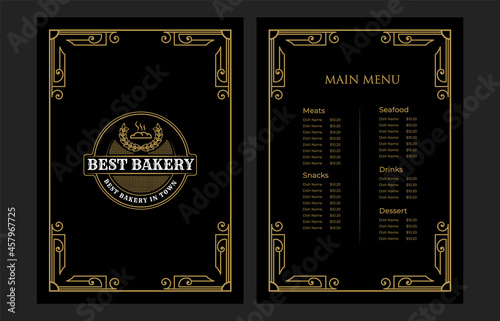 Luxury vintage bakery shop food menu card template ornamental black and golden with emblem logo for hotel cafe bar coffee shop vector print ready