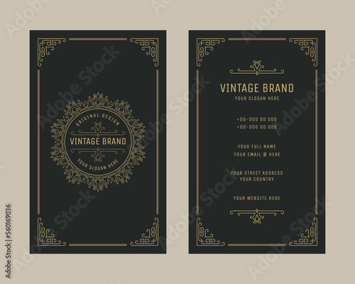 Luxury vintage vertical business card ornament logo template, retro flourishes ornament frame design