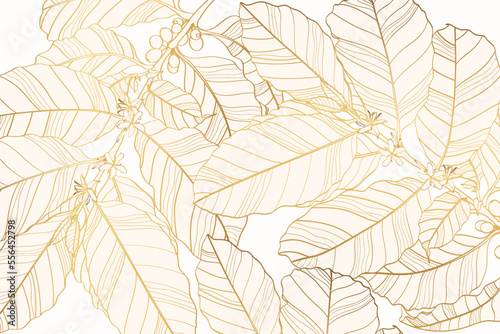 Luxury wallpaper design with golden coffee branches and natural background. Tropical line design for wall art, fabrics, prints and background texture, illustration.