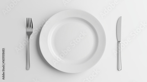 Luxury white tableware set including plates, knife, and fork, neatly arranged on a clean white background, elegant and minimal composition.