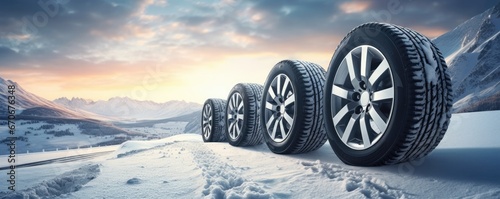 Luxury winter sports car tires near snowy road high in mountains, panorama. Generatve Ai