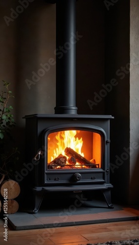 Luxury wood stove, burning embers, premium finish , flames, pellet stove