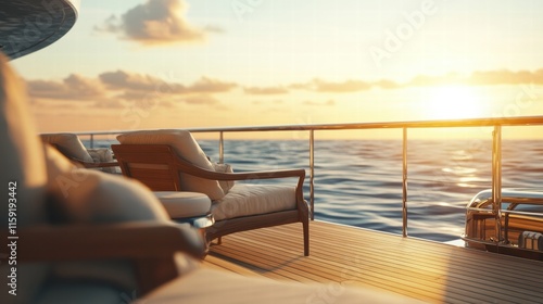 Luxury yacht deck features elegant furniture and sunset view over calm ocean waters. Generative AI
