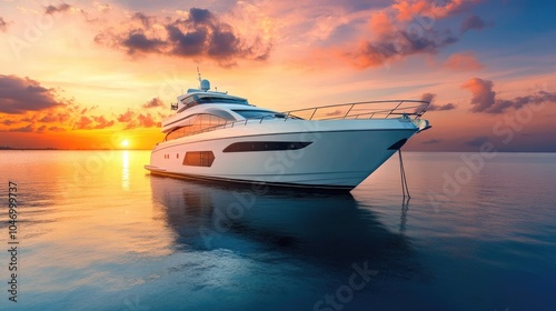 Luxury yacht docked in a serene marina at sunset, the sky ablaze with color, symbolizing wealth, high-end leisure, and sophistication
