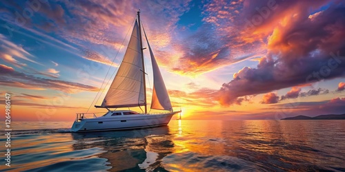 Luxury Yacht Sailing at Sunset, Calm Ocean, Golden Hour, Summer Vacation