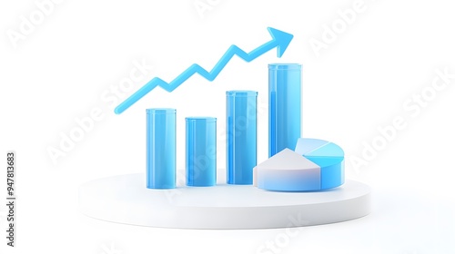 lying composition 3d icon, UI icon, a chart icon, bar chart has a rising arrow on it, bar chart, pie chart, a rising arrow, frosted glass, transparent, white background, transparent technology sense
