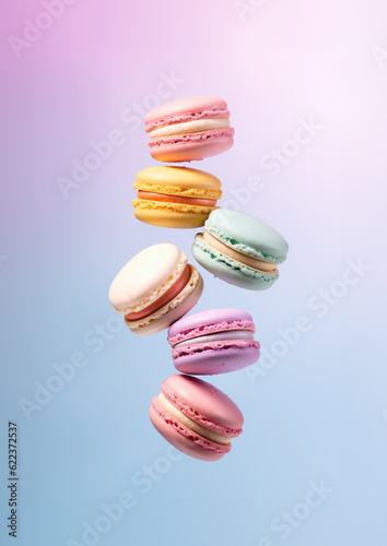 Macaron Dessert. Colorful Macaroons Flying, French macaron cookies, Sweet dessert.
