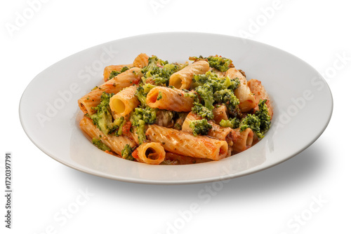 Macaroni tortiglioni pasta with tomato sauce and broccoli on a white plate isolated